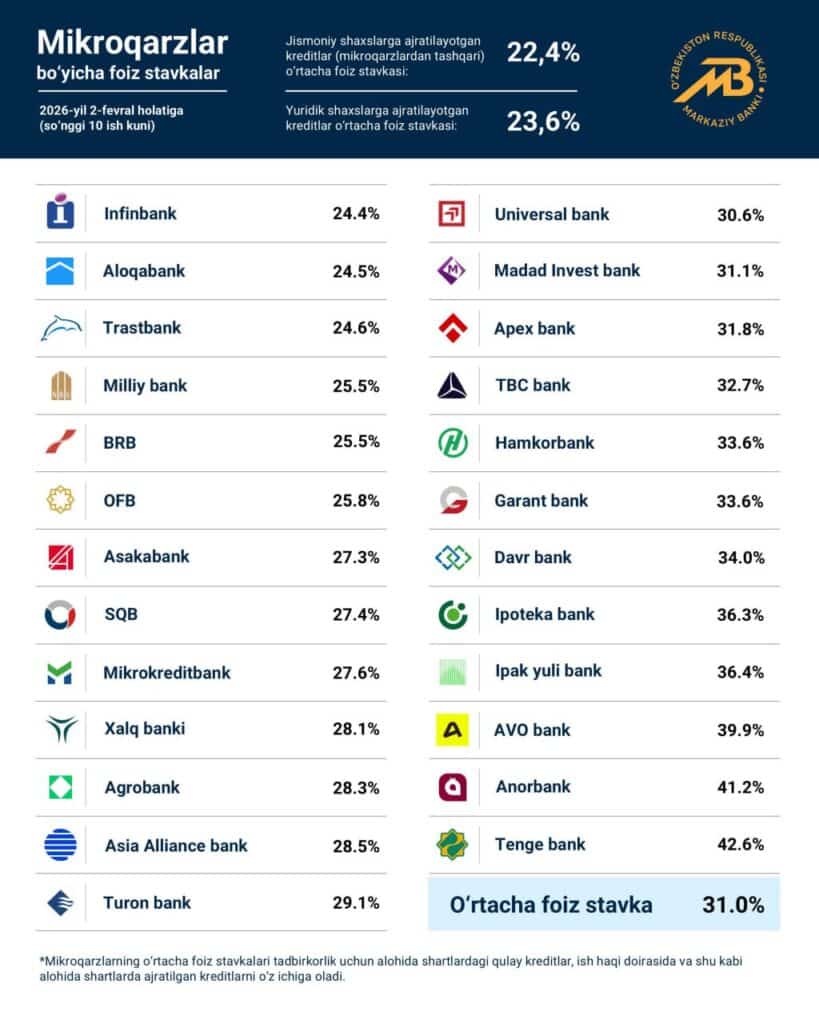 Mikroqarzlar bo‘yicha o‘rtacha foiz stavkasi esa 31 foizni tashkil etdi. Shundan jismoniy shaxslarga ajratilayotgan kreditlarning (mikroqarzlardan tashqari) o‘rtacha foiz stavkasi 22,4 foizni, yuridik shaxslar ulushi esa 23,6 foizni ko‘rsatmoqda.