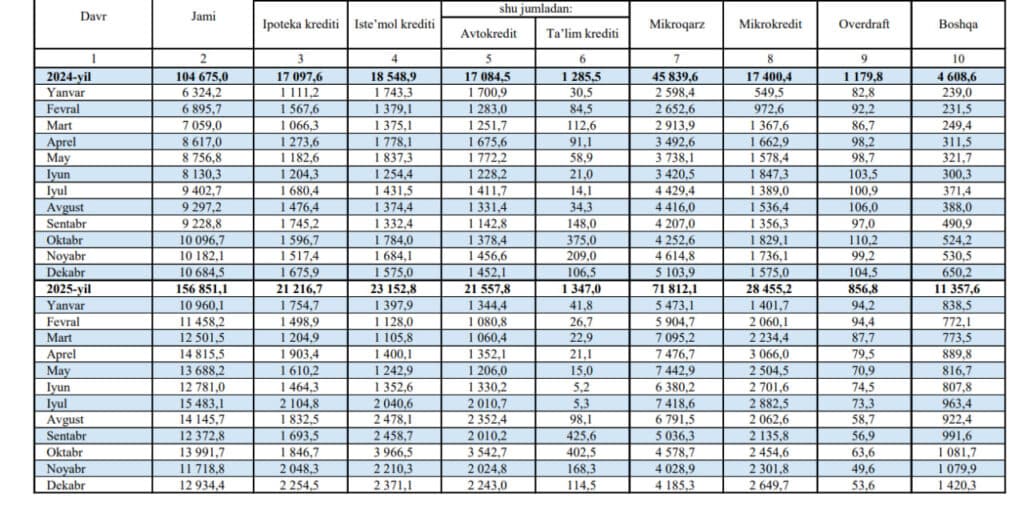 2025-yilda O‘zbekistonda tijorat banklari tomonidan aholiga ajratilgan avtokreditlar va mikroqarzlar miqdori mos ravishda 26,2 va 56,7 foizga o‘sdi. Bu haqda Markaziy bankning 2025-yil yakunlari bo‘yicha hisobotida keltirilgan.