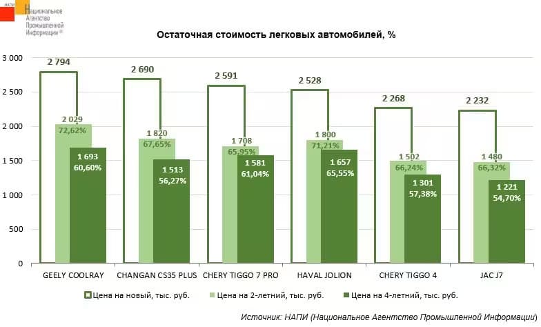 Tahlilchilar shuni qayd etadiki, Chery Tiggo 7 Pro ikki yildan so‘ng qiymatining 65,95%, to‘rt yildan so‘ng esa 61,04% ini saqlaydi. Changan CS35 Plus to‘rt yil davomida faqat 56,27% qiymatni saqlab qoladi. Eng kam likvid model ro‘yxatda JAC J7 liftbek bo‘lib, to‘rt yil egalikdan so‘ng uning narxi yangi avtomobil qiymatining 54,7% ga tushadi.
