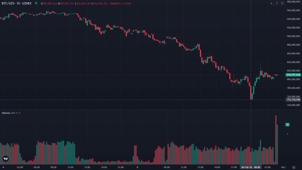 O‘zbekistonning UZNEX birjasi ma’lumotlariga ko‘ra, 6-fevral soat 00:01 da bitkoin narxi $61 minggacha tushib ketgan edi, ammo tonggi savdolarda (09:35 holatiga) $64,8 minggacha ko‘tarildi. Shunga qaramay, umumiy tendensiya pasayish yo‘nalishida qolmoqda.