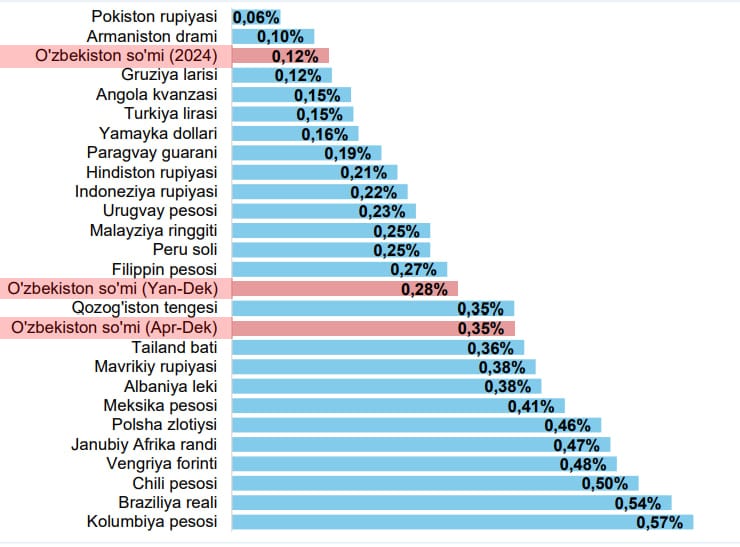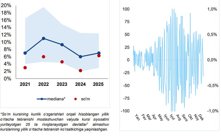 2025-yilda so‘mning o‘rtacha standart og‘ishi so‘mda 42,95 ga teng bo‘lgan bo‘lsa, foiz ko‘rsatkichi 0,34 foizni tashkil etdi (2021–2024-yillarda ushbu ko‘rsatkich 24,17 so‘m yoki 0,21 foizga teng bo‘lgan). O‘tgan yil o‘rtacha kurs 12 ming 575 so‘mni tashkil etgan bo‘lsa, yil davomida kursning eng yuqori qiymati 13 004 so‘mga (o‘rtacha kursdan 5,5 foizga yuqori) va eng quyi qiymati 11 ming 881 so‘mga (o‘rtacha kursdan 3,4 foizga past) teng bo‘ldi.