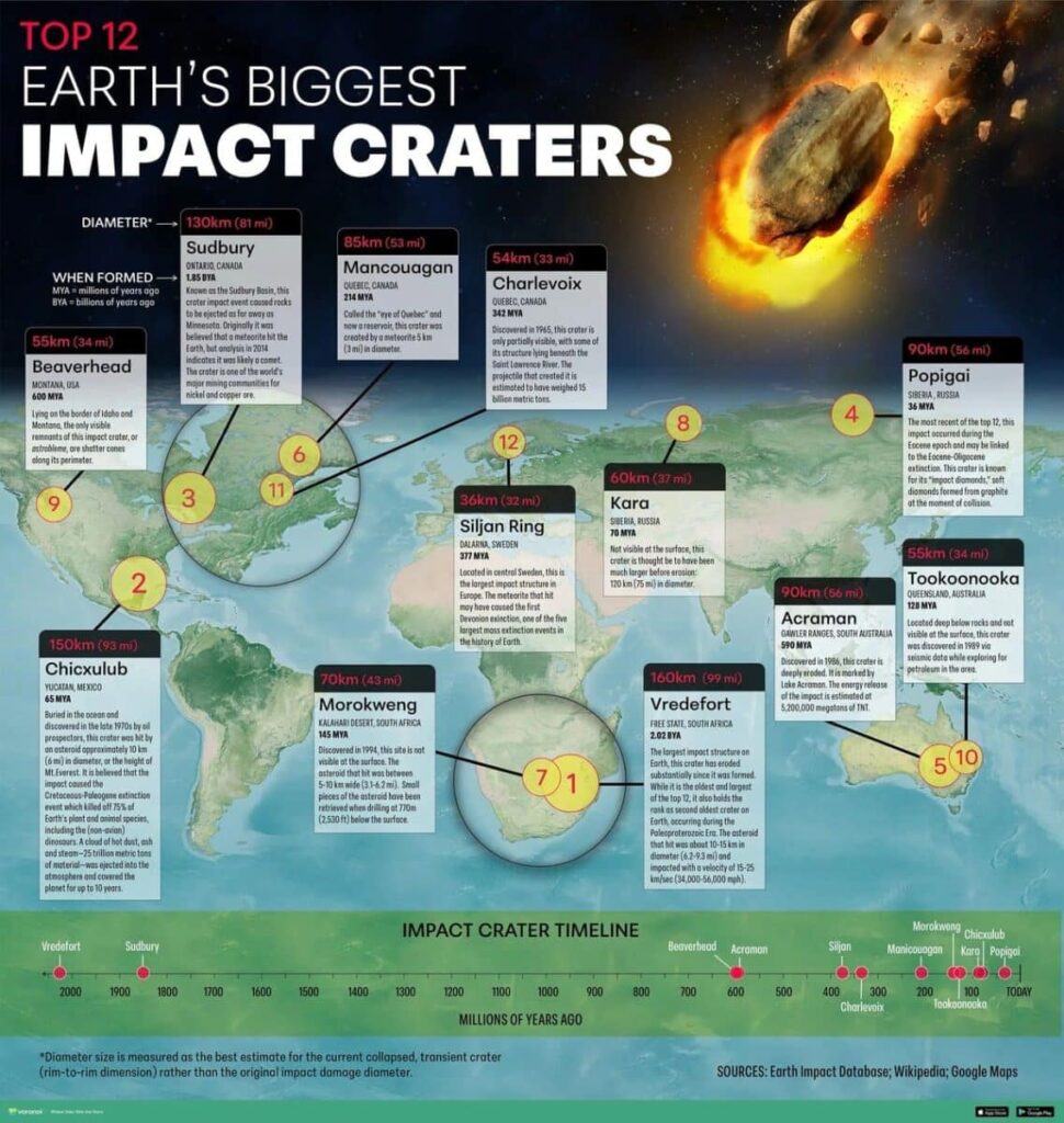 Earth Impact Database ma’lumotlari asosida Visual Capitalist portali mutaxassislari tayyorlagan yangi infografika Yer yuzida tasdiqlangan 12 ta eng yirik zarba kraterini ko‘rsatadi. Ular qadimgi ulkan zarbalar natijasida hosil bo‘lgan havzalardan tortib, nisbatan yaqinda yuz bergan to‘qnashuvlargacha bo‘lgan davrni qamrab oladi.