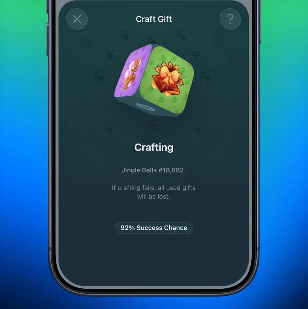 Telegram’dagi sovg‘alar platformasi ham o‘yinlashtirildi. Endi foydalanuvchilar mavjud sovg‘alaridan foydalanib, ma’lum ehtimol asosida yanada noyob sovg‘a yaratish imkoniga ega bo‘ldi. Bunda to‘rt tagacha sovg‘ani birlashtirib, muvaffaqiyat ehtimolini oshirish mumkin. Agar urinish muvaffaqiyatsiz bo‘lsa, ishlatilgan sovg‘alar bekor bo‘ladi.