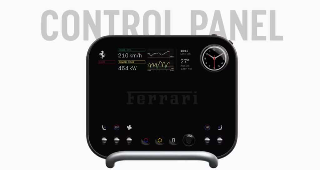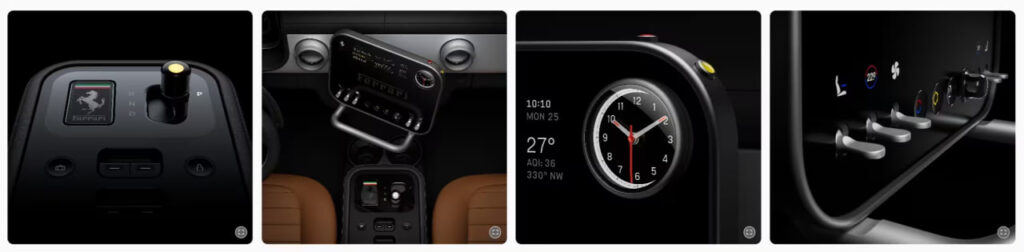 Shuningdek, elektron kalit ham o‘ziga xos dizaynga ega. Uning old panelida sariq fonda Ferrari logotipi bilan katta rangli E Ink ekran joylashgan. Kalit konsoldagi uyaga joylashtirilganda, ekran xira bo‘ladi, bu energiyaning kalitdan avtomobilga uzatilishini ramziy ifodalaydi.