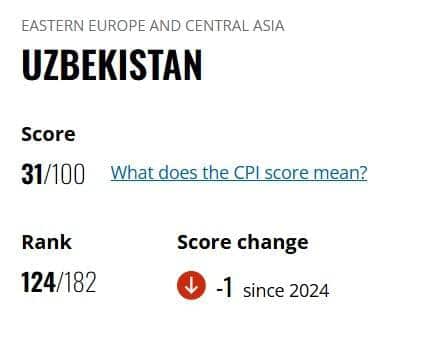 Transparency International tashkilotining 2025-yil uchun yillik ma’lumotlariga ko‘ra, O‘zbekiston yangilangan Korrupsiyani qabul qilish indeksida (CPI) 100 balldan 31 ball oldi va 182 mamlakat orasida 124-o‘rinni egalladi.