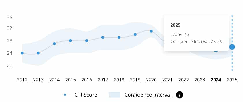Transparency International tashkiloti 2025-yil natijalarini tavsiflab, global korrupsiyaga qarshi kurash ko‘rsatkichi pasayib borayotganini ta’kidlaydi (o‘rtacha ball 42 ballgacha yangi eng past ko‘rsatkichga tushdi). Bundan tashqari, ko‘plab mamlakatlarda vaziyat yomonlashmoqda yoki turg‘unlashmoqda. Hatto an’anaviy ravishda eng yaxshi o‘ntalikning ko‘p qismini egallagan Yevropa mamlakatlarida ham korrupsiyani qabul qilishning o‘rtacha ko‘rsatkichi pasaygan.