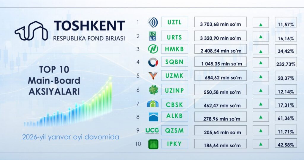 Umuman olganda, yanvar oyidagi ko‘rsatkichlar fond bozorida investorlar faolligi oshib borayotganini va yirik emitentlarga qiziqish yuqori ekanini ko‘rsatmoqda.