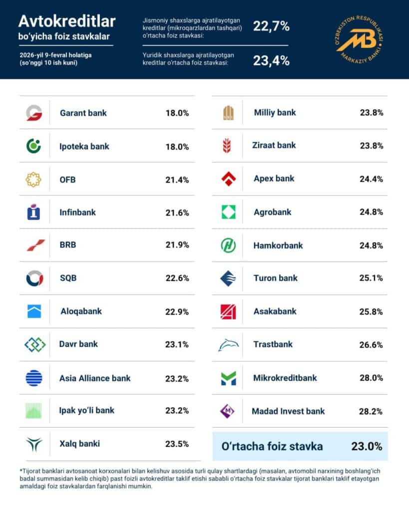 Mazkur davrda mamlakatdagi tijorat banklari tomonidan taqdim etilayotgan avtokreditlar bo‘yicha o‘rtacha foiz stavkasi 23 foizni tashkil etdi. Shundan jismoniy shaxslarga ajratilayotgan kreditlarning (mikroqarzlardan tashqari) o‘rtacha foiz stavkasi 22,7 foizni, yuridik shaxslar ulushi esa 23,4 foizni ko‘rsatmoqda.