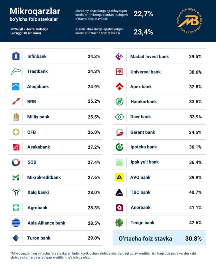 Mikroqarzlar bo‘yicha o‘rtacha foiz stavkasi esa 30,8 foizni tashkil etdi. Shundan jismoniy shaxslarga ajratilayotgan kreditlarning (mikroqarzlardan tashqari) o‘rtacha foiz stavkasi 22,7 foizni, yuridik shaxslar ulushi esa 23,4 foizni ko‘rsatmoqda.