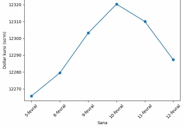 5-fevral kuni 7,39 so‘mga oshib, 12 265,77 so‘mni tashkil qildi. 8-fevral kuni dollarning qiymati 13,71 so‘mga oshib, 12 279,48 so‘mga yetdi. Dollar o‘sishda davom etib, 9-fevral kuni 12 303,16 so‘mni (+23,68 so‘m) tashkil qildi. 10-fevral kuni esa 17,18 so‘mga oshib, 12 320,34 so‘mga yetgandi. 11-fevral kuni dollar 10,35 so‘mga tushib, 12 309,99 so‘mni tashkil etdi.