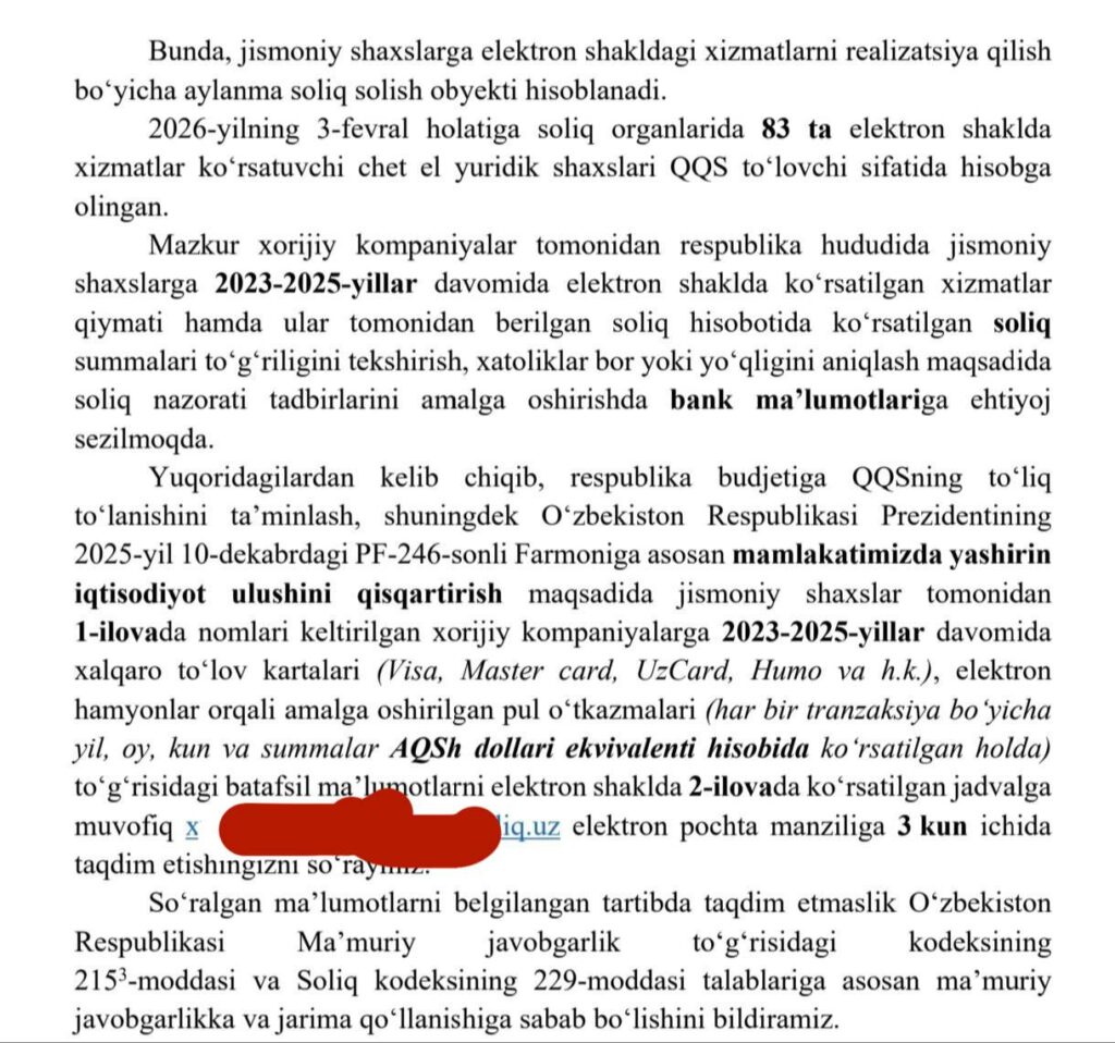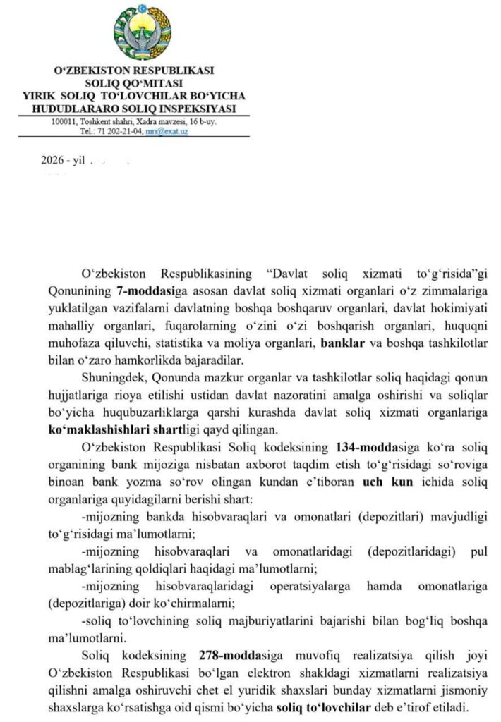 Tarmoqlarda tarqalgan xatda yozilishicha, banklar 2023 – 2025-yillarda jismoniy shaxslar tomonidan O‘zbekistonda soliq hisobiga olingan xorijiy kompaniyalar foydasiga amalga oshirilgan barcha to‘lovlar haqida ma’lumot taqdim etishi kerak.