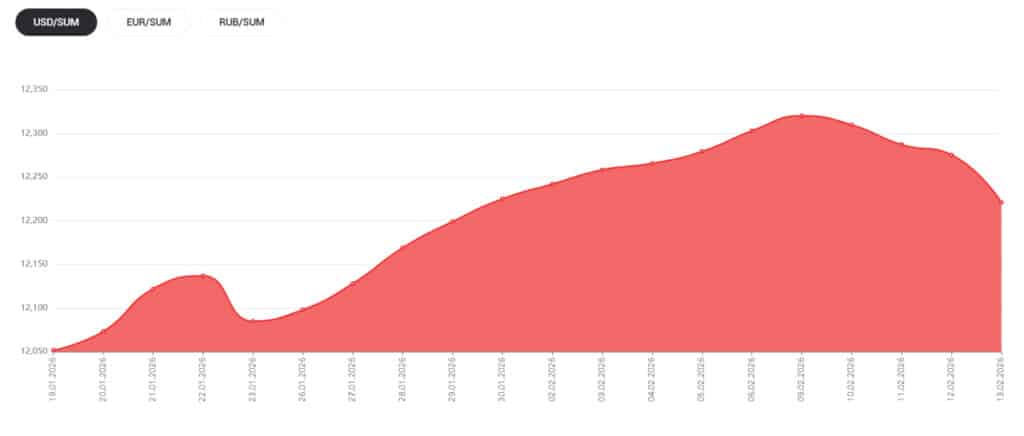 13-fevral kuni yana 11,73 so‘mlik pasayish qayd etilib, kurs 12 275,58 so‘mni tashkil etgan. Rasmiy kurs 16-fevral kuni 54,6 so‘mga tushib, 12 220,98 so‘mga yetadi.