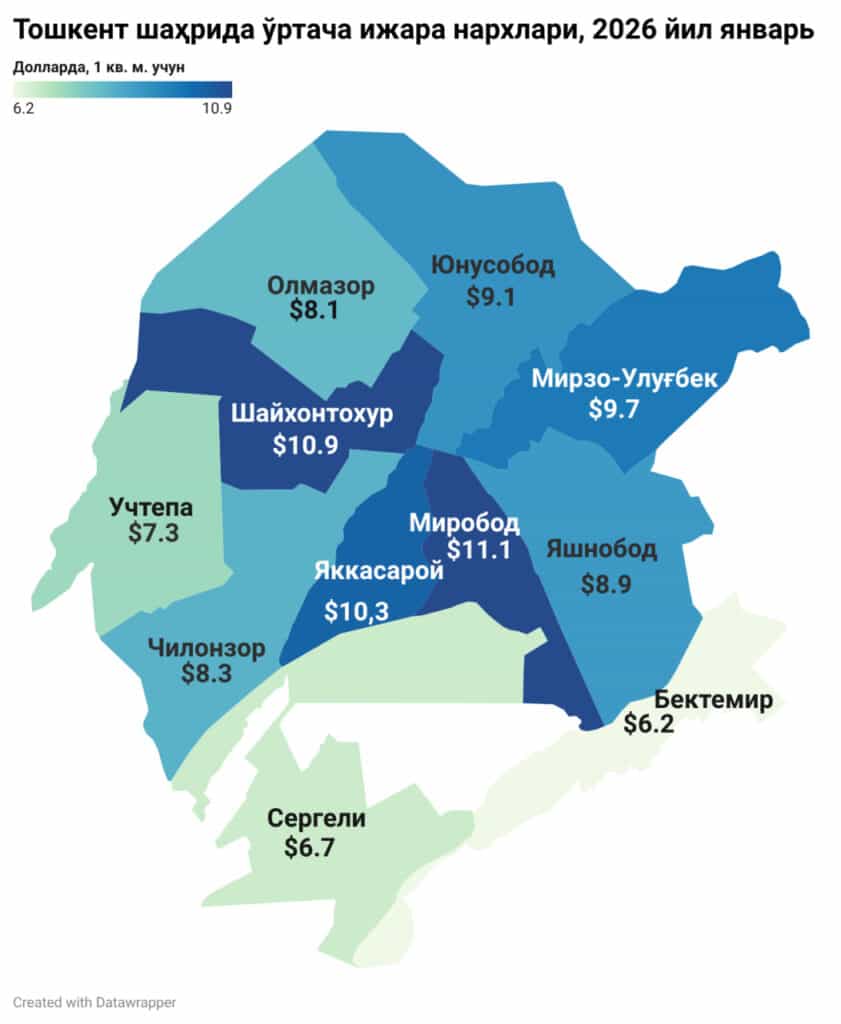 Ijara narxlarining eng yuqori ko‘rsatkichi poytaxtning Mirobod, Shayxontohur, Yakkasaroy va Mirzo Ulug‘bek tumanlarida saqlanmoqda. Bu tumanlarda ijara narxi 1 kv. metr uchun o‘rtacha $11 atrofida.