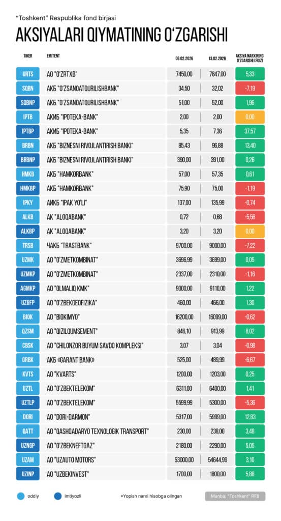 «Toshkent» respublika fond birjasi (RFB)dan joy olgan yuqori likvidli aksiyalarning aksariyati 6-fevraldan 13-fevralgacha bo‘lgan davrda ijobiy dinamikani ko‘rsatib, UCI fond indeksi 2,49 foizga oshdi.