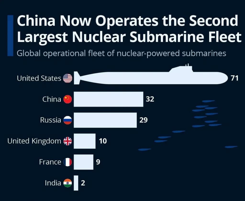 Zamonaviy dunyoda atom suvosti floti milliy xavfsizlik va strategik tiyib turishning muhim elementi bo‘lib qolmoqda. Infografikada turli davlatlar qurolli kuchlari tarkibida nechta atom suvosti kemasi borligi ko‘rsatilgan.