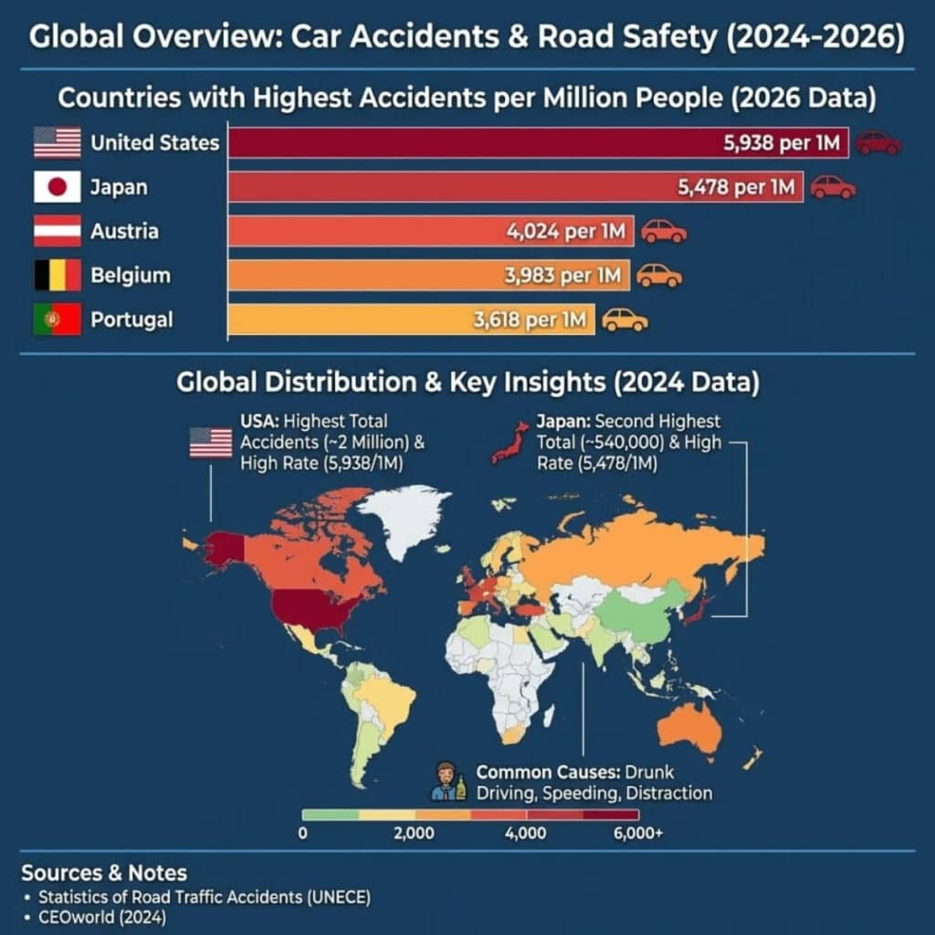 CEOWorld ma’lumotiga ko‘ra, umumiy YTHlar soni bo‘yicha yetakchilar qatoriga Yaponiya 540 ming bilan, Germaniya 300 ming bilan, Turkiya 174 ming bilan va Italiya 172 ming bilan kirgan. Biroq har 1 mln aholiga to‘g‘ri keladigan hodisalar soni bo‘yicha Avstriya Germaniyadan yuqori ko‘rsatkich qayd etgan. Avstriyada bu ko‘rsatkich 4 024 ta, Germaniyada esa 3 612 tani tashkil etgan.