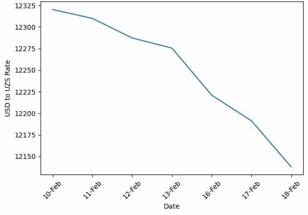 10-fevral kuni esa 17,18 so‘mga oshib, 12 320,34 so‘mga yetgandi. 11-fevral kuni dollar 10,35 so‘mga tushib, 12 309,99 so‘mni, 12-fevral kuni esa 22,68 so‘mga tushib, 12 287,31 so‘mni tashkil etdi. 13-fevral uchun dollar 11,73 so‘mga tushib, 12 275,58 so‘mga yetgandi. 16-fevral kuni dollar 54,6 so‘mga tushib, 12 220,98 so‘mni, 17-fevral kuni esa 29,68 so‘mga tushib, 12 191,30 so‘mni tashkil etdi.
