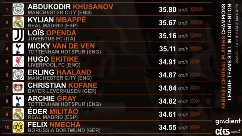 U Kylian Mbappe (35,67 km/soat, Real Madrid), Loïs Openda (35,16 km/soat, Yuventus), Hugo Ekitike (34,91 km/soat, Liverpul) va Erling Holand (34,87 km/soat, Manchester Siti) kabi yulduzlarni ortda qoldirdi.