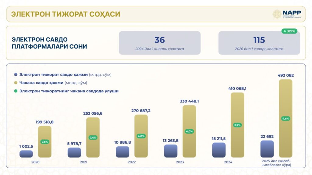 Rasmiy ma’lumotlarga ko‘ra, elektron tijorat platformalari soni 36 tadan 115 taga yetdi, ya’ni o‘tgan yilga nisbatan 3,2 baravar ko‘paydi.