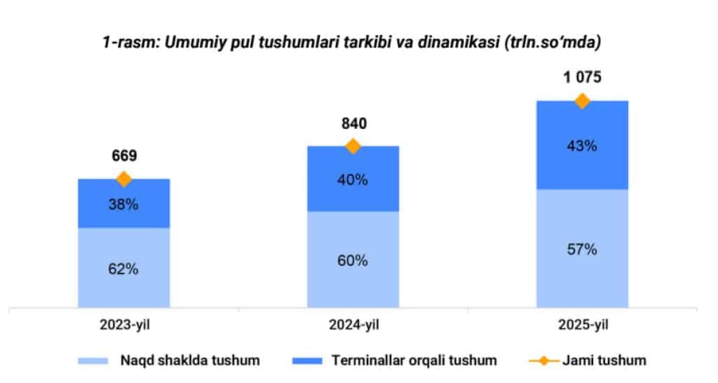 2025-yilda naqd pul va terminal orqali umumiy pul tushumlari 1,1 kvadrillion so‘mni tashkil etib, 2024-yilga nisbatan 28 foizga oshdi. Bu haqda Markaziy bank ma’lumotlarida keltirilgan.