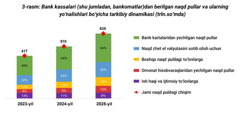 2025-yilda bank kassalari (shu jumladan, bankomatlar)dan jami berilgan naqd pullar 2024-yilga nisbatan 125 trln so‘mga yoki 25 foizga oshdi. Mazkur holat asosan bank kartalaridan naqd pul yechish hajmining 54 trln so‘mga, banklar tomonidan aholidan naqd chet el valyutasini sotib olish uchun berilgan naqd pullar hajmining 27 trln so‘mga hamda aholining omonat hisobvaraqlaridan naqd pul yechishi 18 trln so‘mga o‘sishi hisobiga yuzaga keldi.
