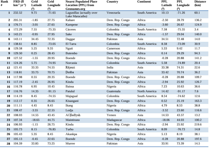 Ayrim hududlarda momaqaldiroq va chaqmoq faolligi dunyo o‘rtacha ko‘rsatkichidan bir necha barobar yuqori. Bunga geografiya, iqlim va atmosfera sharoitlari sabab bo‘ladi. Quyidagi infografikada har bir qit’adagi asosiy faol nuqtalar ko‘rsatilgan. Xarita yilda bir kvadrat kilometrga to‘g‘ri keladigan chaqmoq zarbalari zichligiga asoslangan.