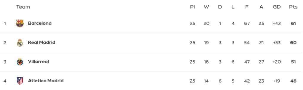 Ma’lumot uchun, 25-turdan keyin 61 ochko to‘plagan «Barselona» turnir jadvalini boshqarmoqda. Madridning «Real» klubi 60 ochko bilan ikkinchi o‘rinda bo‘lsa, kuchli uchlikni 51 ochko bilan «Villarreal» egalladi. To‘purarlar ro‘yxatida esa 23 gol bilan Kilian Mbappe yetakchilik qilmoqda.