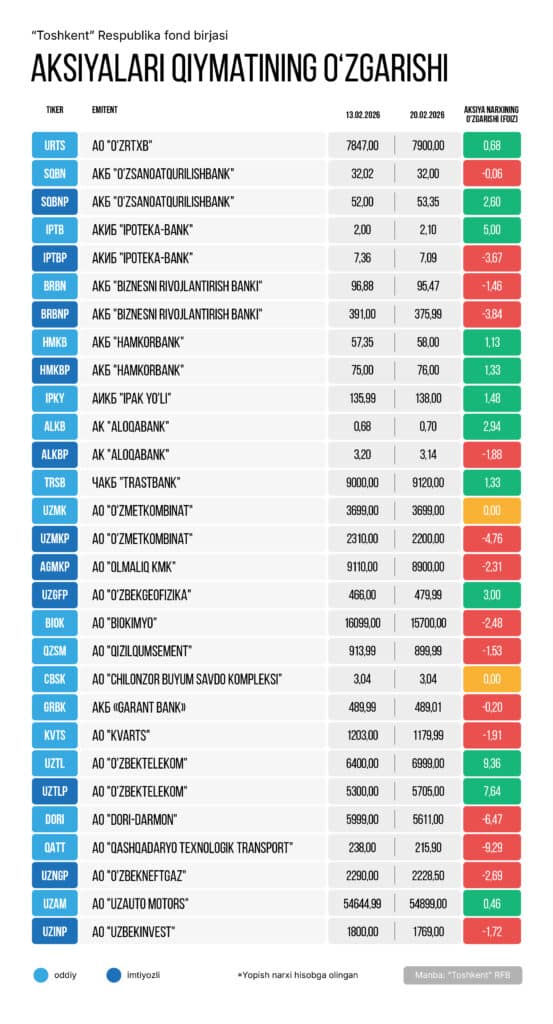 «Toshkent» respublika fond birjasi (RFB)dan joy olgan yuqori likvidli aksiyalarning aksariyati 13-fevraldan 20-fevralgacha bo‘lgan davrda salbiy dinamikani ko‘rsatdi. Ammo UCI fond indeksi 2,3 foizga oshdi.