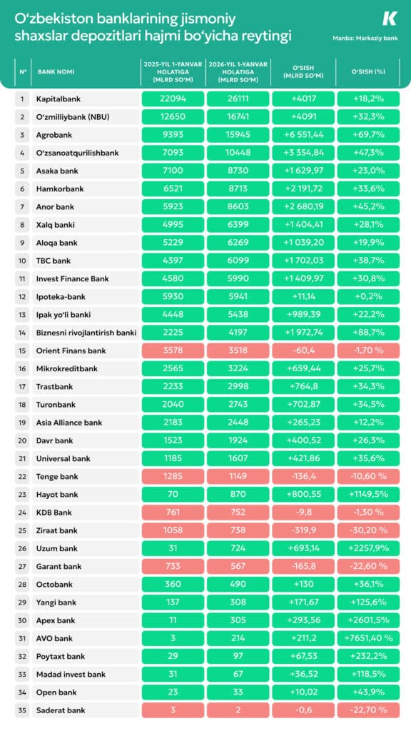 Ma’lumotlar O‘zbekiston Respublikasi tijorat banklarining 2025-yil 1-yanvar va 2026-yil 1-yanvar holatiga ko‘ra hisobotlariga asoslangan.