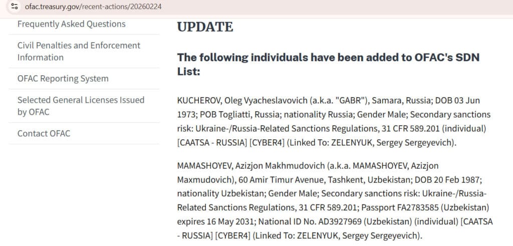 Unga nisbatan CAATSA doirasida Rossiyaga aloqador sanksiyalar ham qo‘llanmoqda. Hujjatlarda uning O‘zbekiston fuqarosi ekani, pasport va shaxsiy identifikatsiya ma’lumotlari ham qayd etilgan.