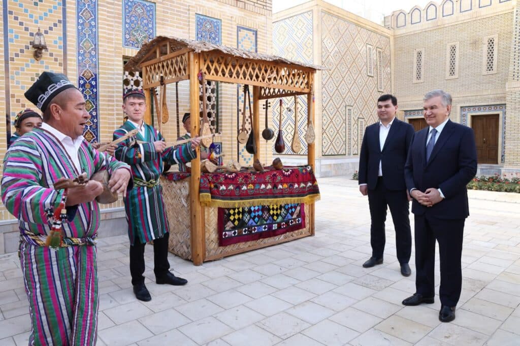 Prezident etnoshaharchada yaratilgan sharoitlar bilan tanishib, hunarmandlar bilan muloqot qildi hamda tashrif buyuruvchilar uchun tashkil etilgan madaniy dasturini tomosha qildi.