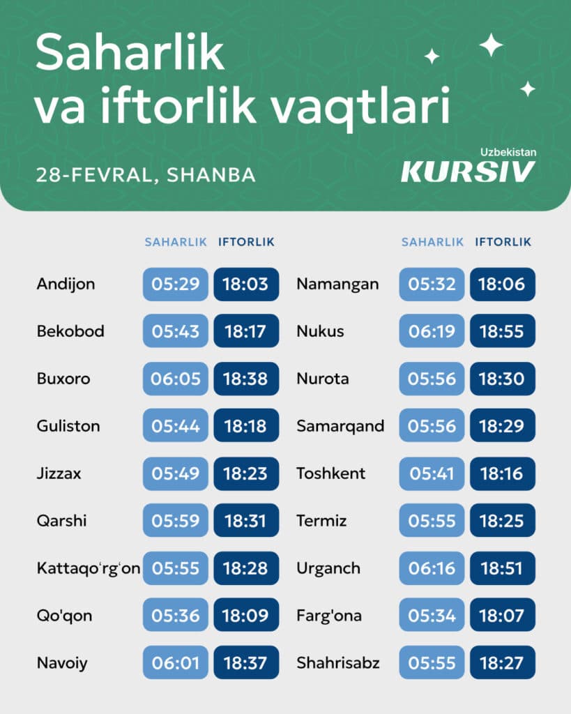 28-fevral, shanba kuni muborak Ramazon oyining o‘ninchi kuni boʻlib, Toshkent shahrida saharlikning tugashi soat 5:41 ni tashkil qiladi. Iftorlik esa 18:16 da boshlanadi.