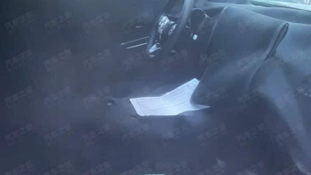 Salon hozircha kamuflyaj bilan yopilgan. Ichkarida katta gorizontal sensorli ekran, D shaklidagi rul va kichik raqamli asboblar paneli borligi ko‘rinadi.