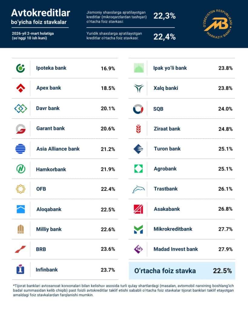 Markaziy bank izohiga ko‘ra, avtomobil ishlab chiqaruvchilar yoki dilerlar bilan hamkorlik asosida beriladigan kreditlarda foiz stavkalari pastroq bo‘lishi mumkin. Shuningdek, avtokreditlar bo‘yicha stavkalar avtomobil turi, yoshi, boshlang‘ich badal miqdori va boshqa shartlarga qarab farq qiladi.