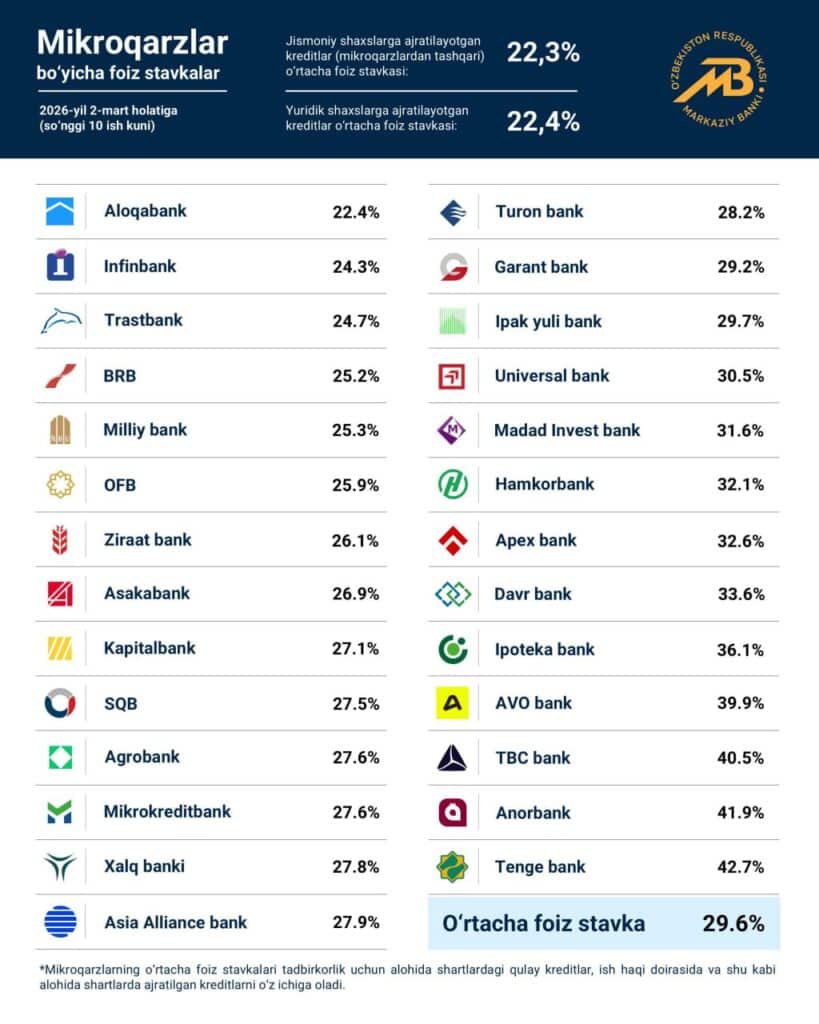 Mikroqarzlar bo‘yicha o‘rtacha foiz stavkasi esa 29,6 foizni tashkil etdi. Shundan jismoniy shaxslarga ajratilayotgan kreditlarning (mikroqarzlardan tashqari) o‘rtacha foiz stavkasi 22,3 foizni, yuridik shaxslar ulushi esa 22,4 foizni ko‘rsatmoqda.