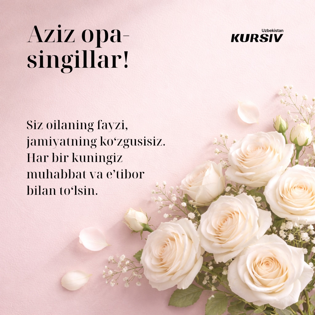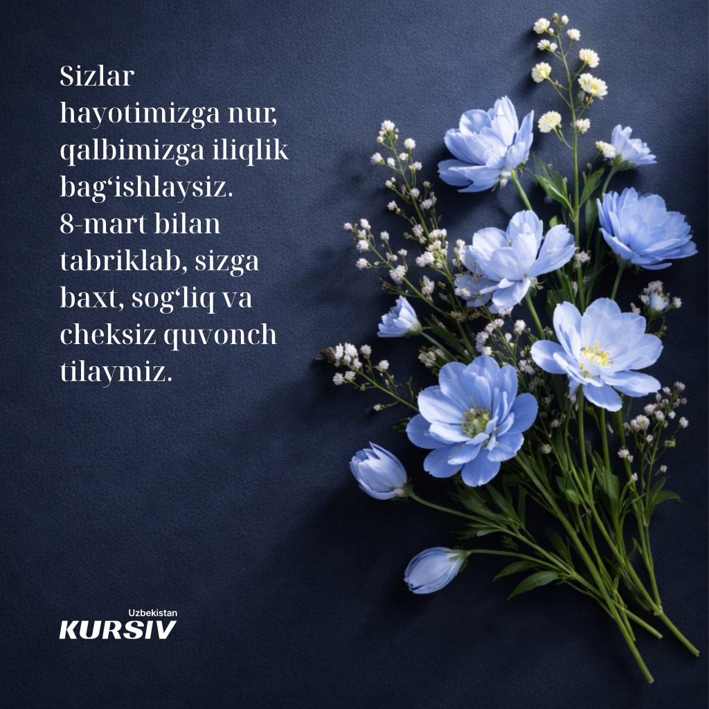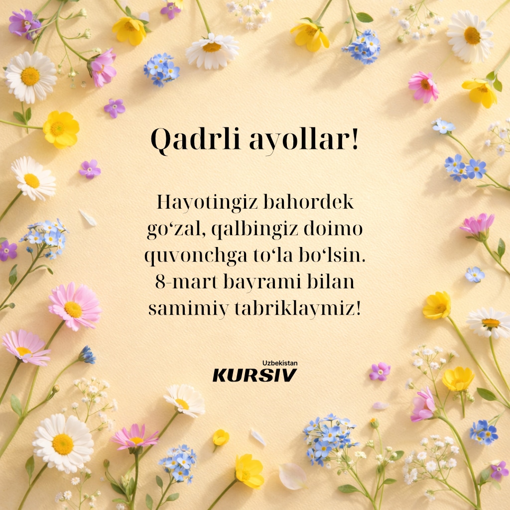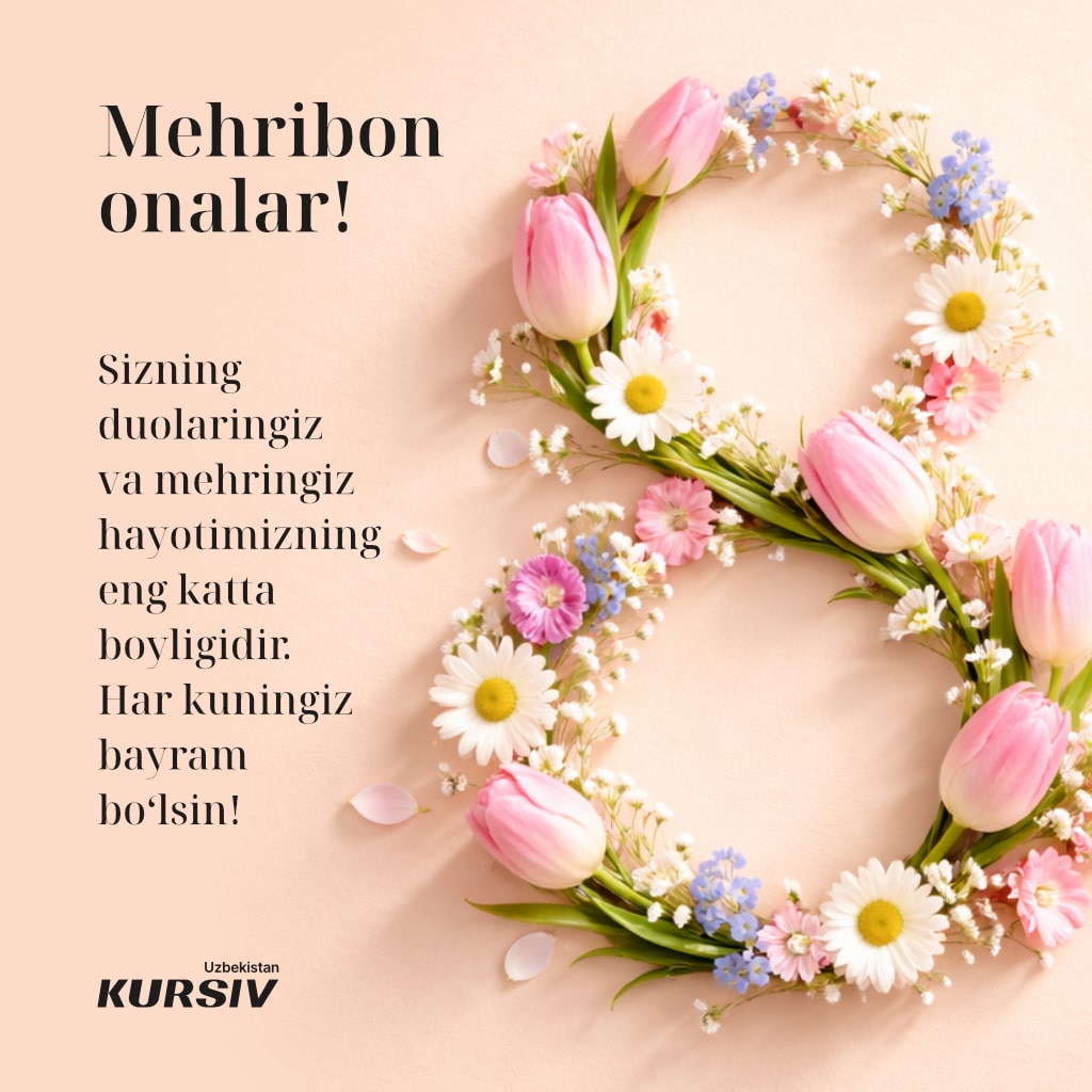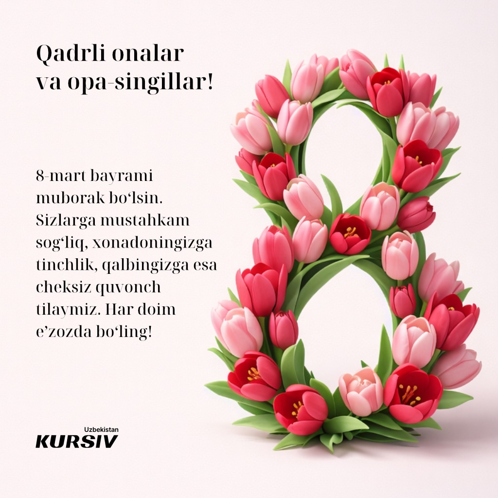 Dunyoning ko‘plab nuqtalarida 8-mart — Xalqaro xotin-qizlar bayrami keng nishonlanadi. Kursiv Uzbekistan bayram munosabati bilan aziz ona va opa-singillarimiz hamda boshqa yaqin insonlarimizni tabriklash uchun tabriknomalar tayyorladi. Ularni yaqinlaringizga joʻnatib, xursand qiling.