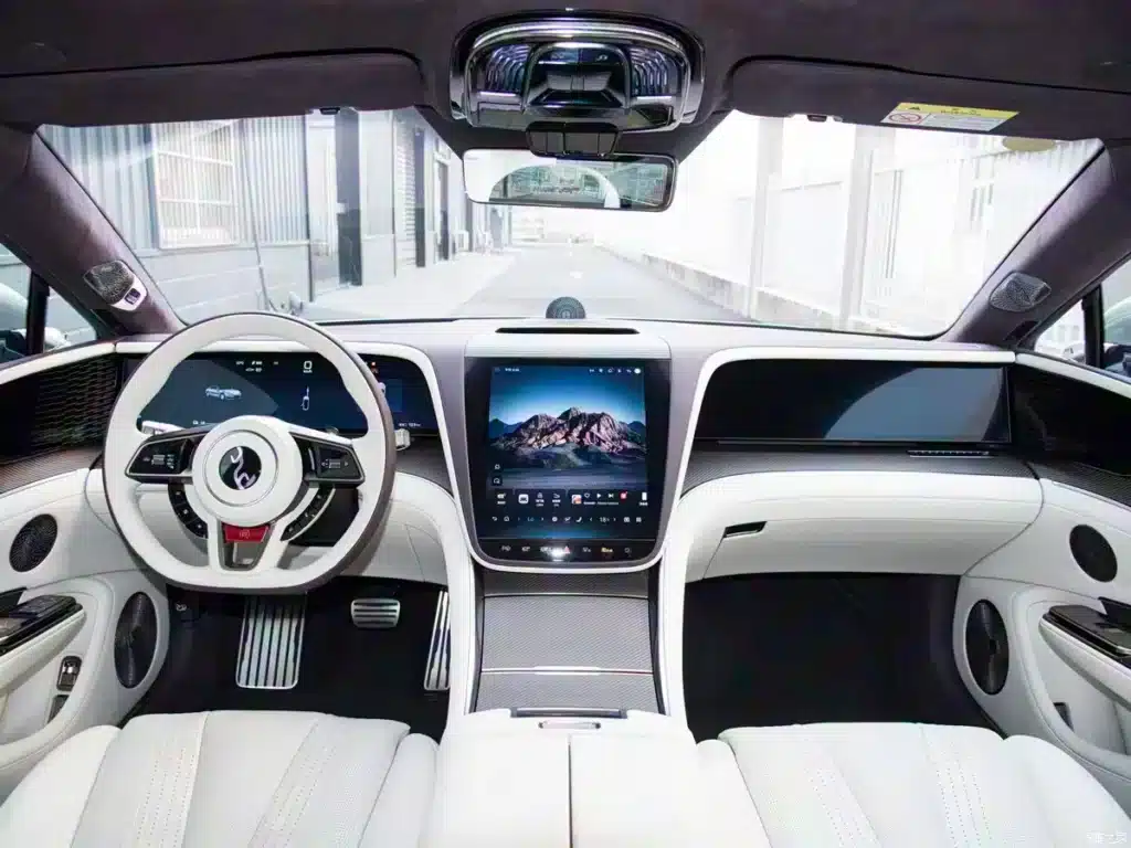 Avtomobil saloni simmetrik dizaynda ishlangan bo‘lib, yirik vertikal markaziy ekran, LCD asboblar paneli va oldingi yo‘lovchi uchun alohida ko‘ngilochar ekran bilan ta’minlangan. Xaridorlar 4 va 5 o‘rindiqli konfiguratsiyalar o‘rtasida tanlov qilishlari mumkin. Barcha o‘rindiqlar Nappa terisi bilan qoplangan hamda isitish, ventilyatsiya va massaj funksiyalariga ega.