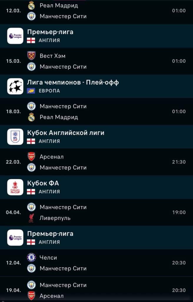 «Manchester Siti»ni mart va aprel oylarida o‘ta murakkab va tig‘iz uchrashuvlar kutib turibdi. Jamoa 11-martdan 19-aprelga qadar bo‘lgan vaqt oralig‘ida «Real Madrid» bilan ikki marta, shuningdek, «Arsenal», «Liverpul» va «Chelsi» klublariga qarshi ketma-ket maydonga tushishi lozim. Ular Chempionlar ligasi hamda barcha ichki turnirlarda top-jamoalarga qarshi sinovdan o‘tadi.