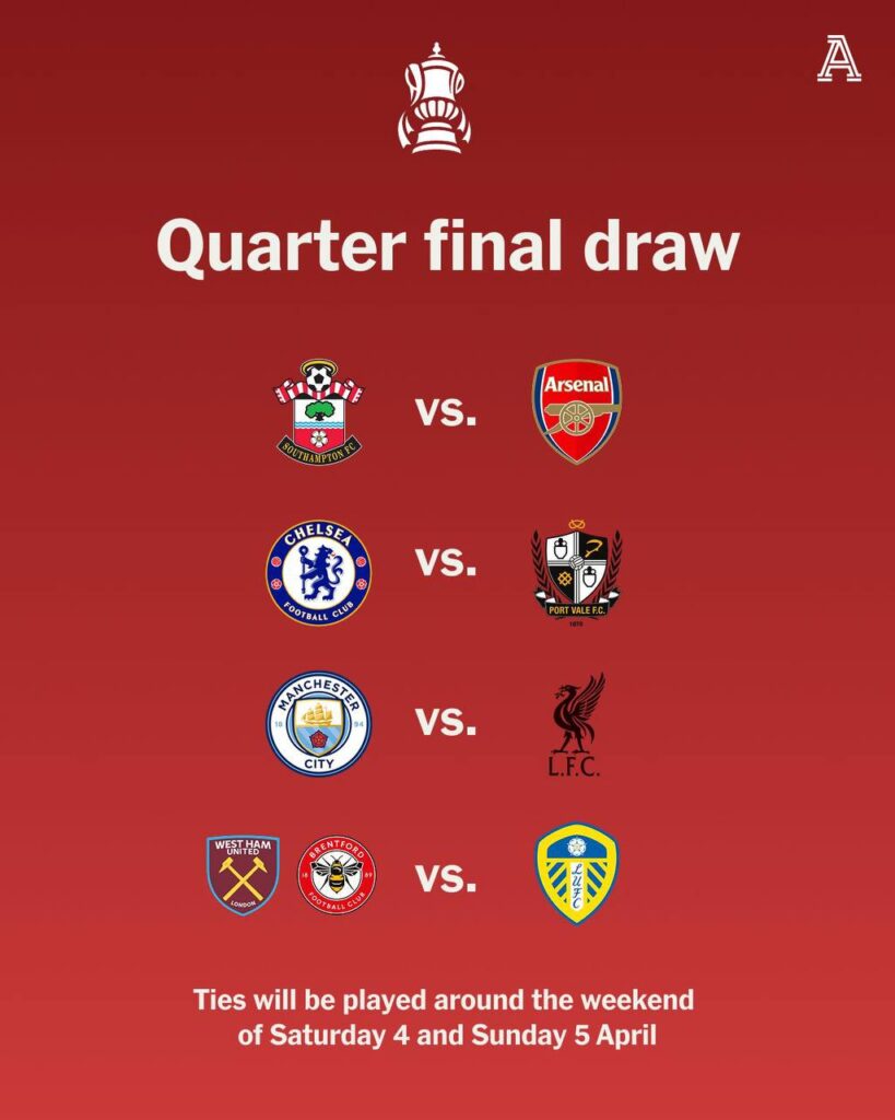 Qur’a natijalariga ko‘ra, uchinchi liga autsayderi «Port Veyl» o‘z maydonida «Chelsi»ga qarshi o‘ynaydi. Premyer-liga peshqadami «Arsenal» esa Chempionship vakili «Sautgempton» bilan mehmonda kuch sinashadi. «Lids» esa «Vest-Hem» hamda «Brentford» juftligi g‘olibiga qarshi maydonga chiqadi.