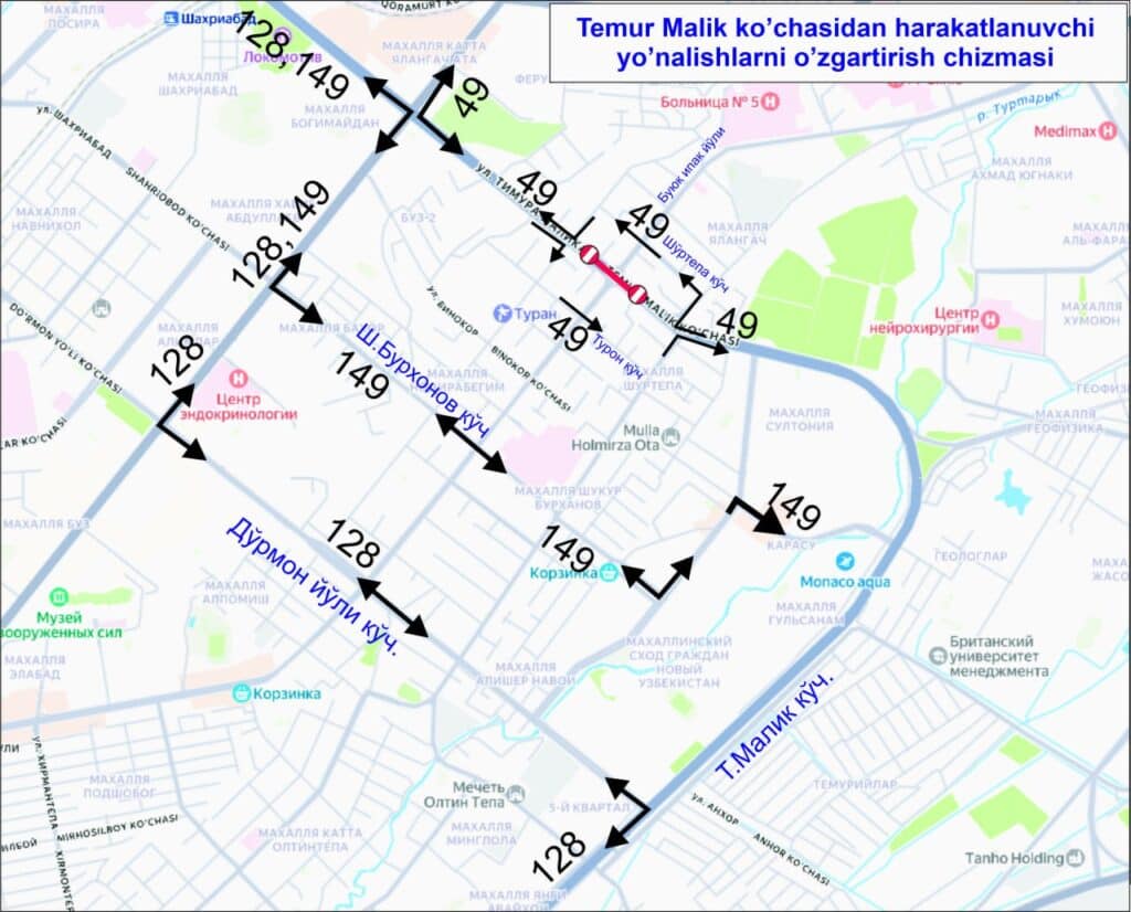 Toshkent shahar transport bosh boshqarmasiga ko‘ra, Temur Malik ko‘chasi orqali qatnaydigan quyidagi avtobuslar yo‘nalishi vaqtincha o‘zgartirildi: