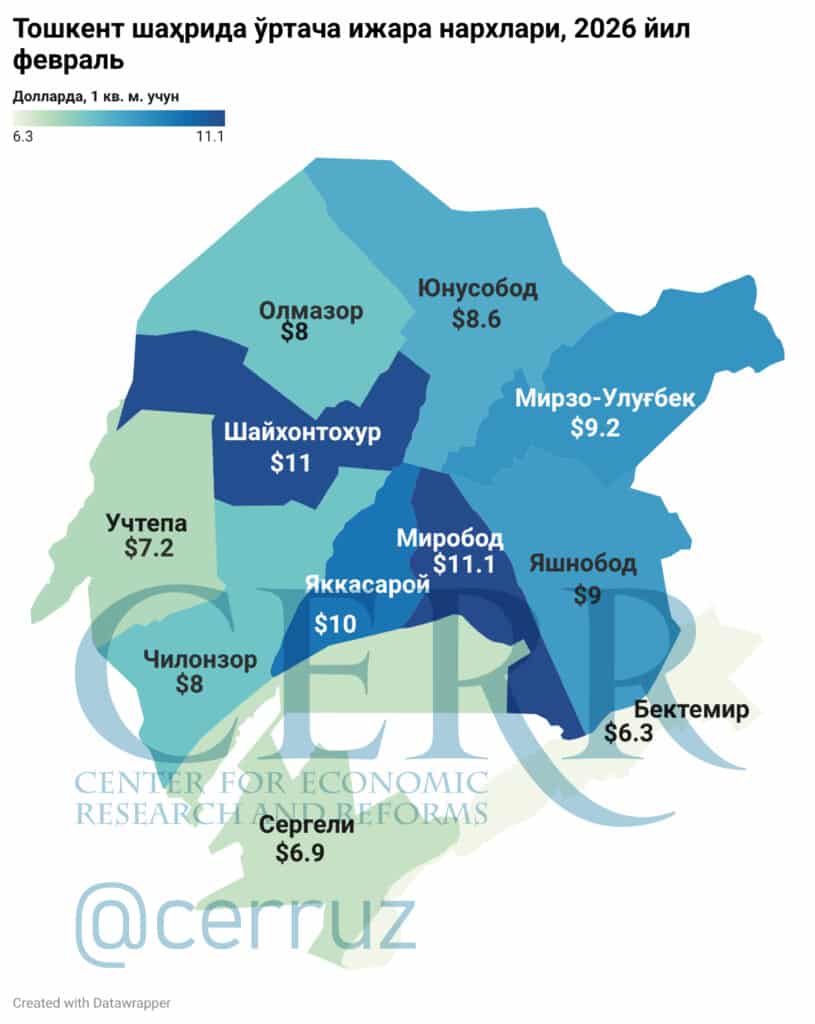 Poytaxt markazida ijara narxlari yuqori darajada qolmoqda. Mirobod, Shayxontohur, Yakkasaroy va Mirzo Ulug‘bek tumanlarida narxlar kvadrat metr uchun $11 atrofida bo‘lgan.