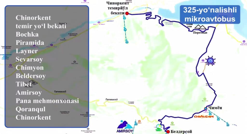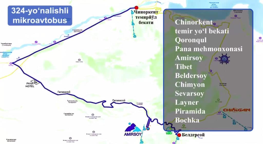 324-sonli yo‘nalish Chinorkent temir yo‘l bekatidan boshlanib, Qoranqul, Pana mehmonxonasi, Amirsoy, Tibet, Beldersoy, Chimyon, Sevarsoy, Layner, Piramida va Bochka orqali harakatlanadi.