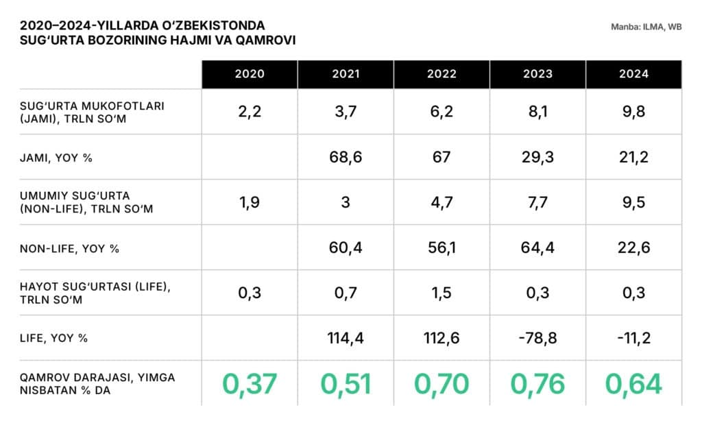 O‘zbekiston sug‘urta bozori so‘nggi yillarda jadal sur’atlar bilan o‘smoqda. 2020–2024-yillarda mukofotlar hajmi to‘rt baravardan ko‘proqqa, ya’ni 2,2 trlndan 9,8 trln so‘mga oshdi. Raqamlarda o‘sish sezilarli, ammo iqtisodiyot miqyosida sug‘urta hali ham past o‘rinni egallamoqda.