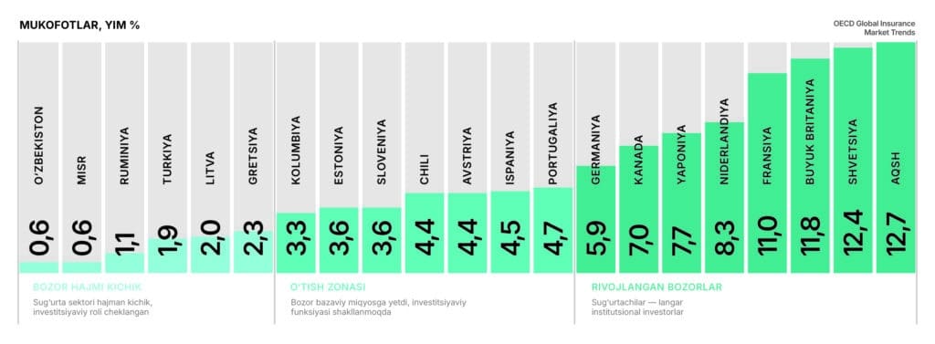 Dunyo tajribasida sug‘urta kompaniyalari qamrov darajasi YIMning bir necha foiziga yetganda institutsional investor sifatida sezilarli rol o‘ynay boshlaydi. Sug‘urtalovchilar kapital bozorida asosiy, ya’ni «langar» investor bo‘lib qatnashadigan aksariyat mamlakatlarda bu ko‘rsatkich barqaror ravishda YIMning 5 foizidan yuqori bo‘ladi.