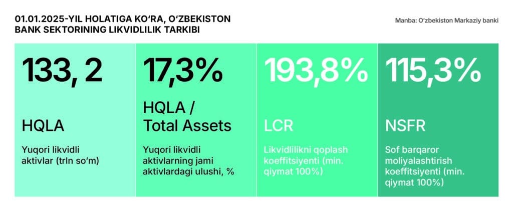 Resurs bazasi banklarga ko‘proq investitsiya kiritish imkonini beradi. 2025-yil boshida banklarning yuqori likvidli aktivlari hajmi 133,2 trln so‘mni yoki jami aktivlarning 17,3 foizini tashkil etdi. Likvidlilikni qoplash koeffitsiyenti (LCR) 193,8 foizni tashkil etib, minimal talabdan deyarli ikki baravar yuqori bo‘ldi, sof barqaror moliyalashtirish koeffitsiyenti (NSFR) esa 115,3 foizni tashkil etib, barqaror uzoq muddatli moliyalashtirishni ko‘rsatdi.