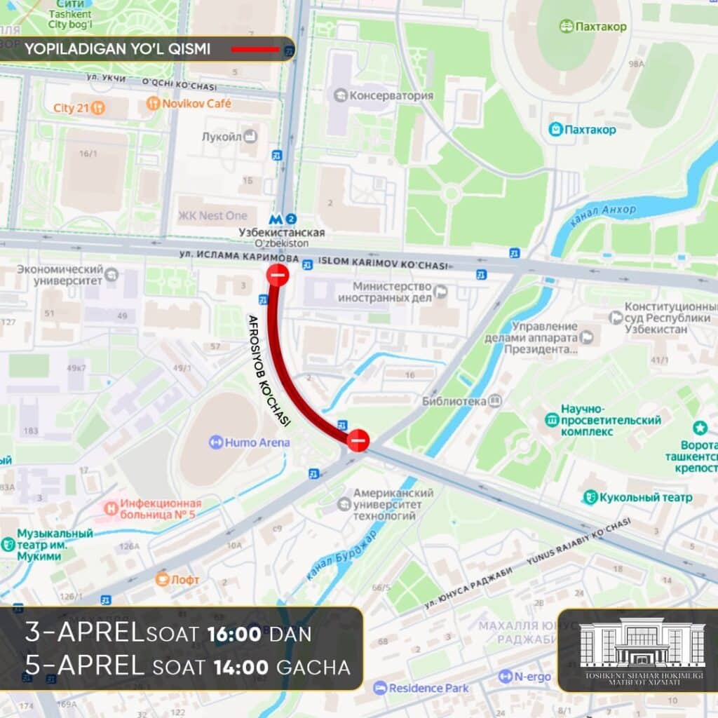 Shahar hokimligi haydovchilardan ushbu cheklovlarni e’tiborga olib, harakat yo‘nalishlarini oldindan rejalashtirishni so‘radi.