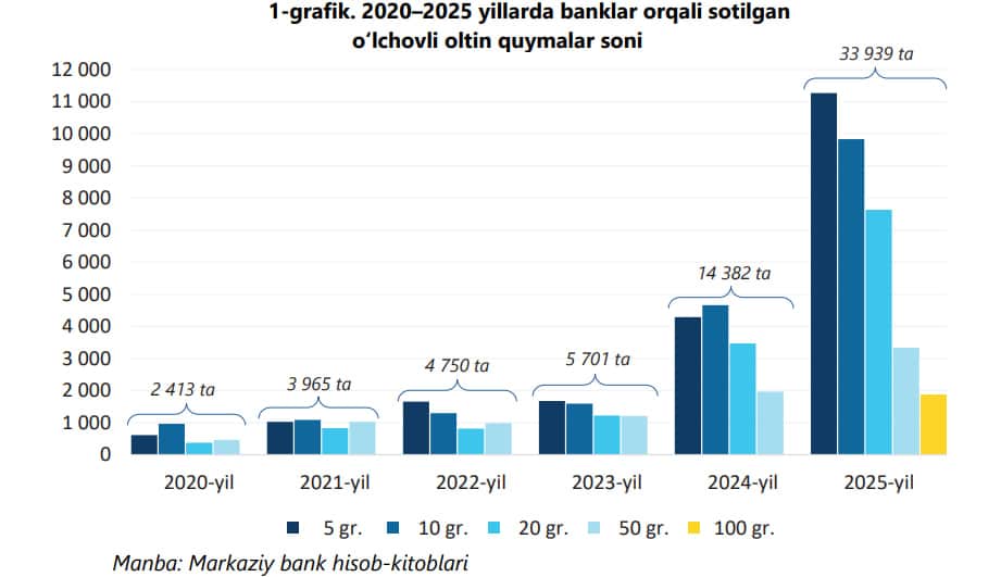 2025-yil alohida rekord yil bo‘ldi. Shu yilda sotilgan oltin quymalar hajmi 2020 – 2024-yillardagi umumiy ko‘rsatkichdan 18,4 foizga yuqori bo‘ldi. Donalar soni ham 33 939 taga yetib, oldingi davrdan 8,7 foizga oshdi.