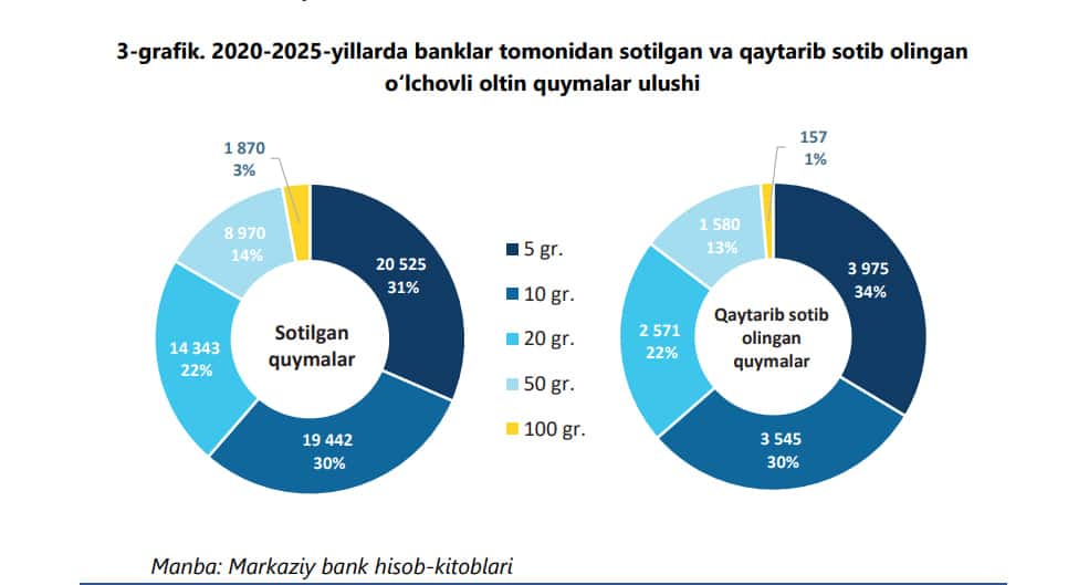 Shu bilan birga, 2020 – 2025-yillarda banklar tomonidan aholidan 201 kg oltin qayta sotib olingan. Bu jami 11,8 ming dona quyma degani. Qaytarib sotib olingan quymalar tarkibida ham 5 va 10 grammli mahsulotlar ustunlik qilgan. Ularning ulushi qariyb 65 foizni tashkil etgan.