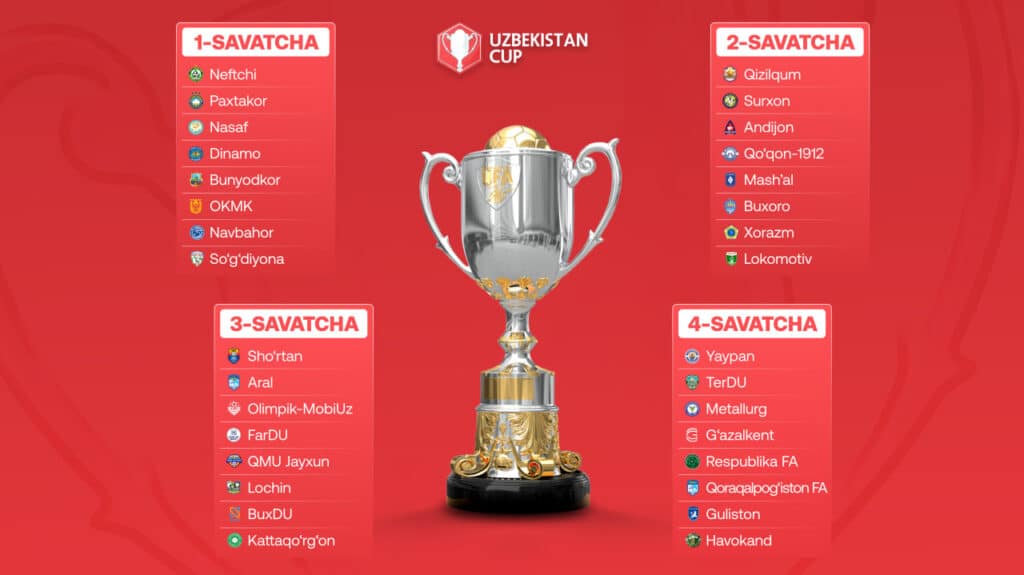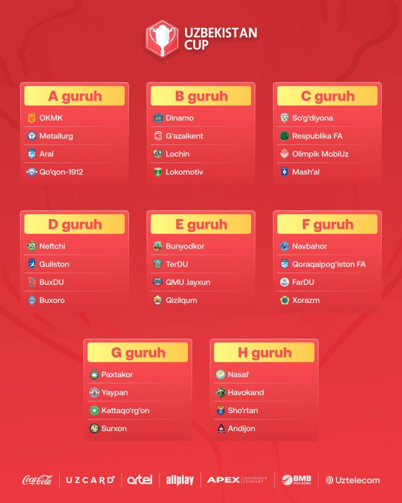 Bugun, 2-aprel kuni O‘zbekiston kubogi guruh bosqichiga qur’a tashlandi. Joriy yilning 8 – 26-may kunlari musobaqaning guruh bosqichi uchrashuvlari bo‘lib o‘tadi.