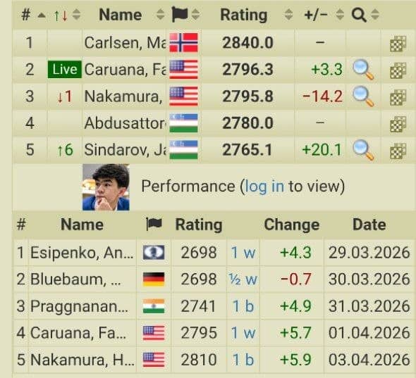 3-aprel kuni Javohir Sindarov 2026-yilgi FIDE Nomzodlar turnirining 5-turida AQShlik kuchli raqibi Hikaru Nakamurani ortda qoldirib, dunyoning eng kuchli besh shaxmatchisidan biriga aylandi.